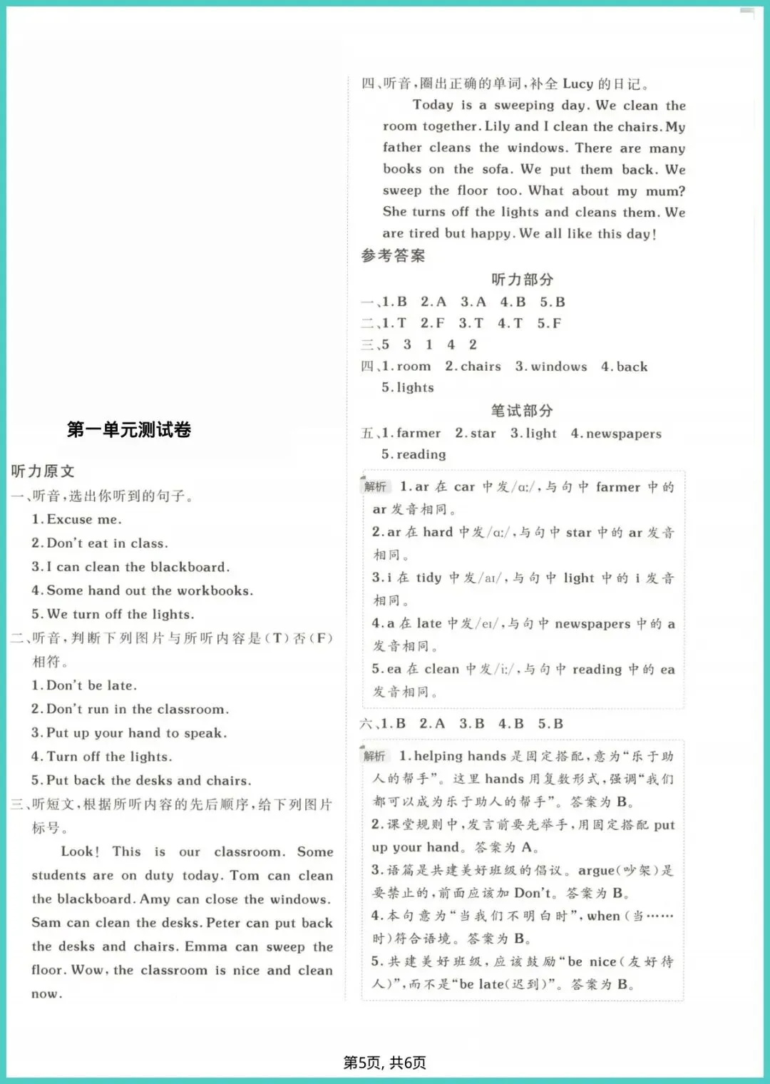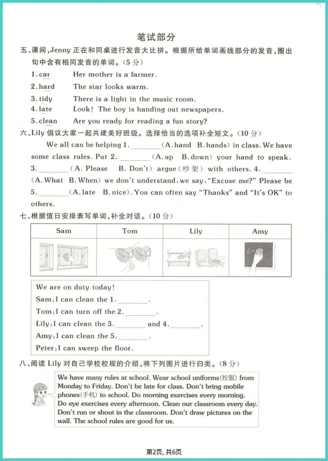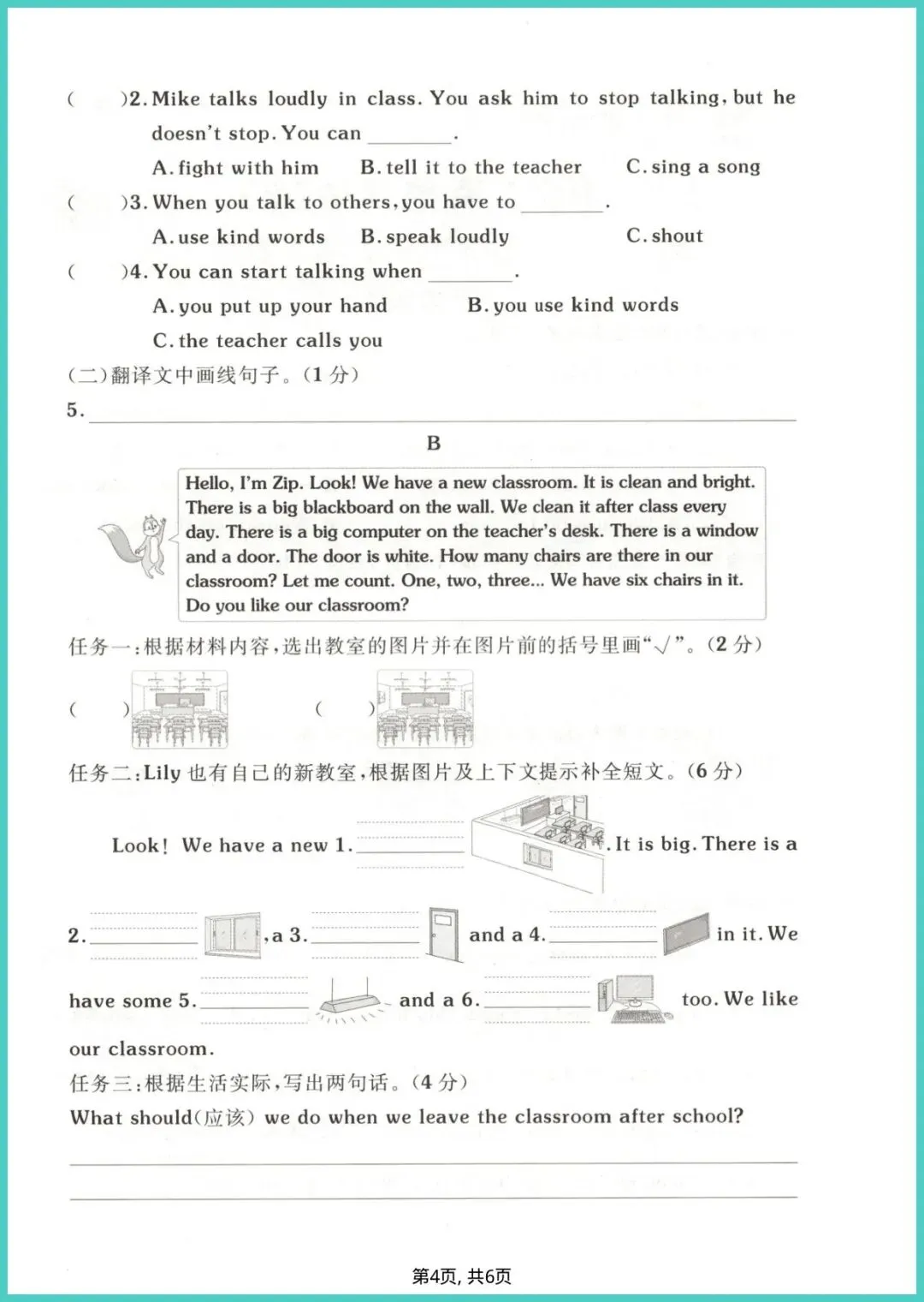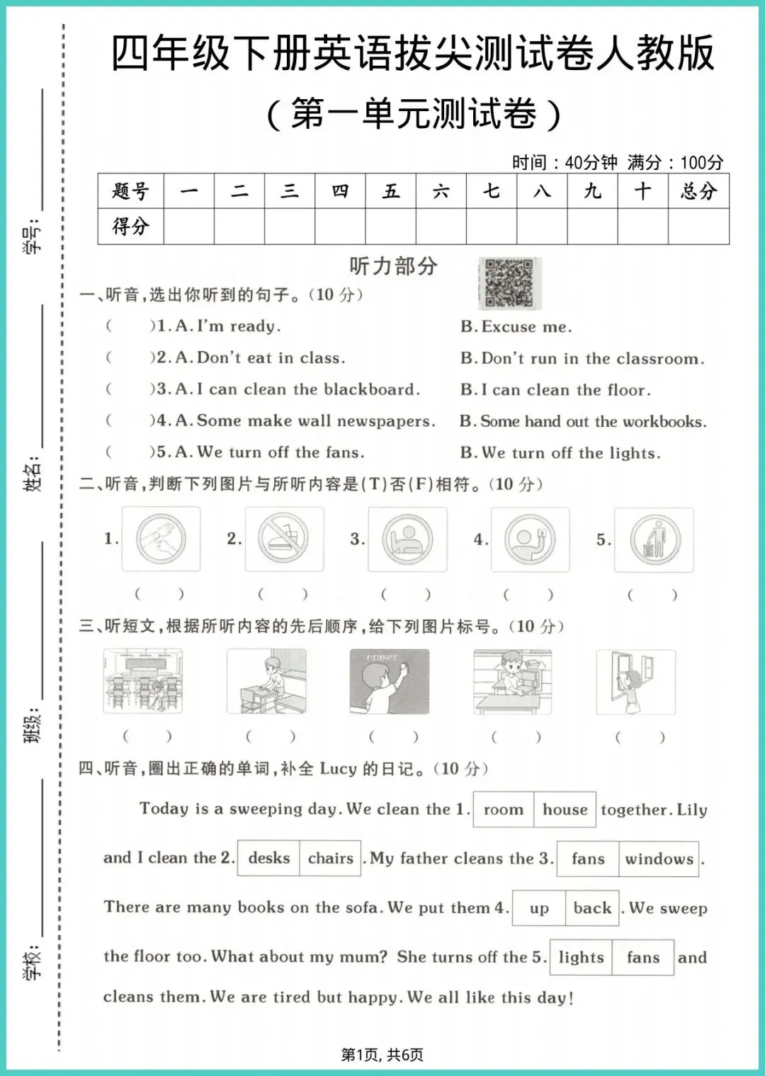 26年春人教版四年级下册英语第一单元拔尖测试卷,6页电子版一键打印!紧扣课本“Where is my schoolbag?”话题,涵盖高频词汇、句型转换、情景对话、阅读拔高四大模块,每题配梯度点拨,帮孩子突破“会背不会用”的瓶颈;压轴思维题接轨小升初,提前练速度、练准确度。现在打印,今晚就能练,错过开学就落后!需要的家长快把资料装进书包,让孩子抢先领跑单元榜首!