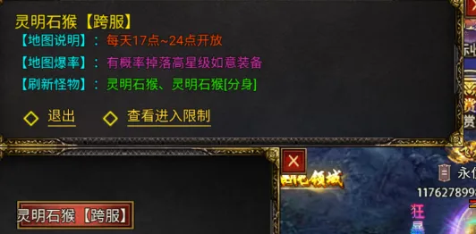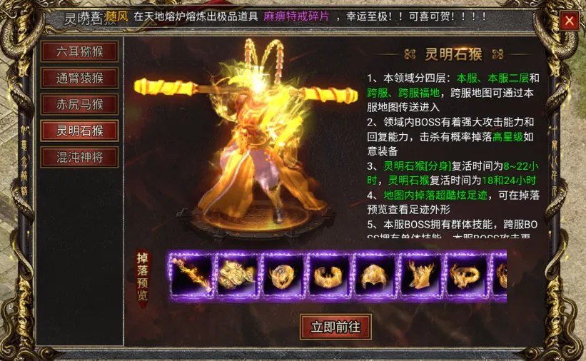 大家好,今天跟大家介绍一下混沌领域中最后一只猴子灵明石猴的活动攻略,灵明石猴是混沌领域的最强BOSS,是需要开服250天才能开启的,