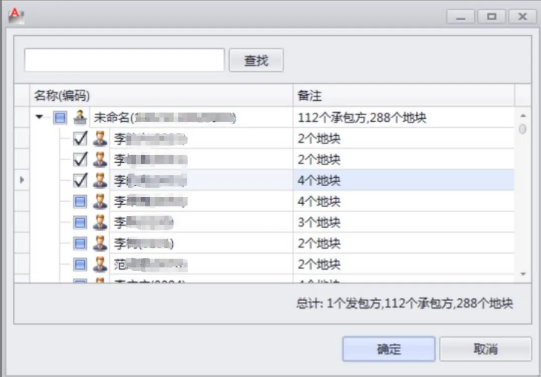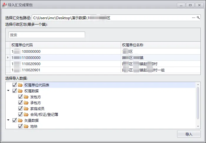 导入汇交成果包:将汇交成果包导入到软件中,转换生成地块矢量数据和入户调查权属数据。支持分级选择导入镇、村、组级数据。