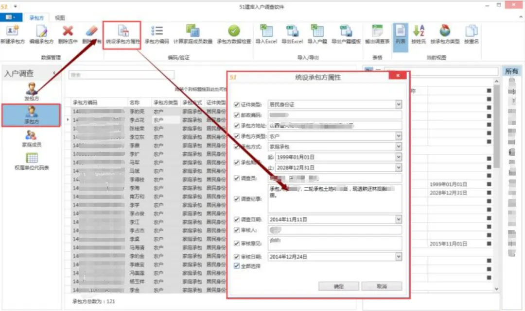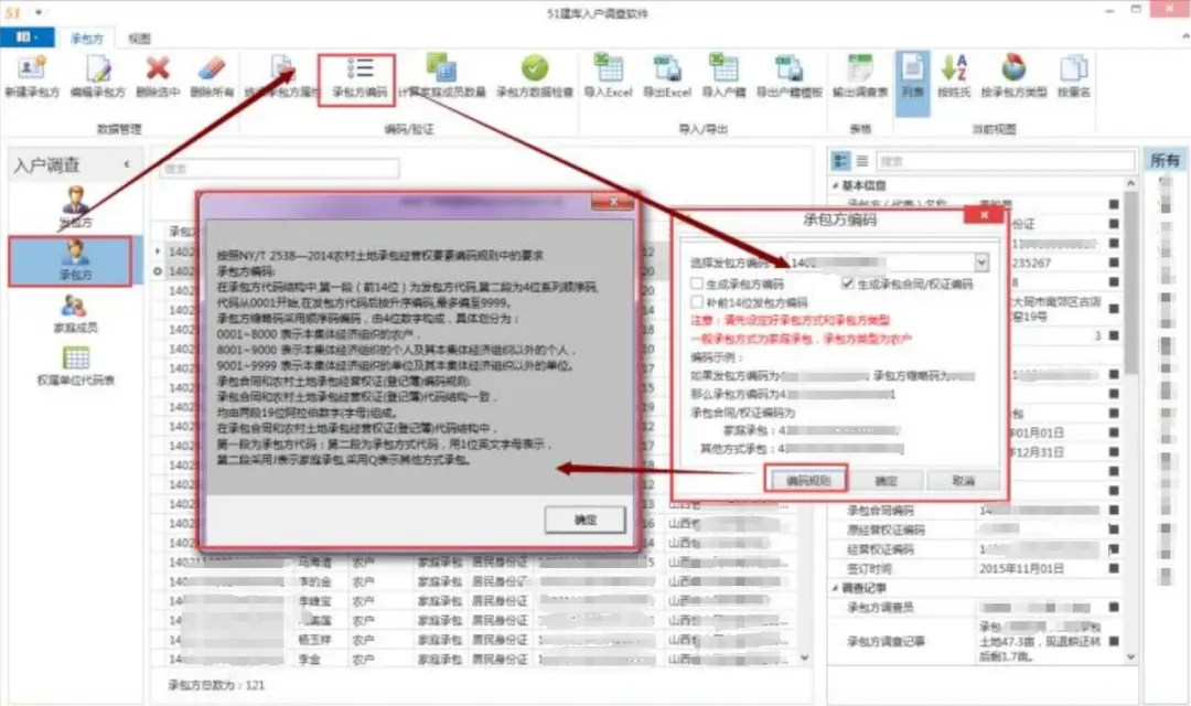 入户调查:快速设置承包方属性,生成18位承包方位编码和合同编码/权证编码,提高工作效率。