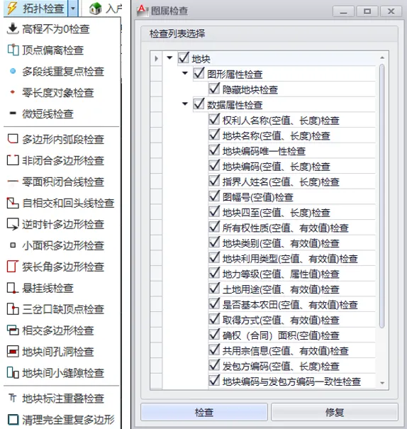 属性与拓扑检查:内置权属数据、矢量数据质检规则,自动定位错误,支持常见拓扑错误自动修复,也支持手动修复拓扑错误,保证数据质量。