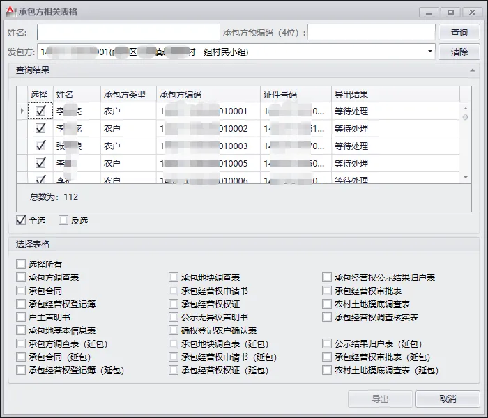 表格输出:按户输出摸底表、承包方调查表、地块调查表、归户表、承包合同等表格成果,满足各种业务需求。