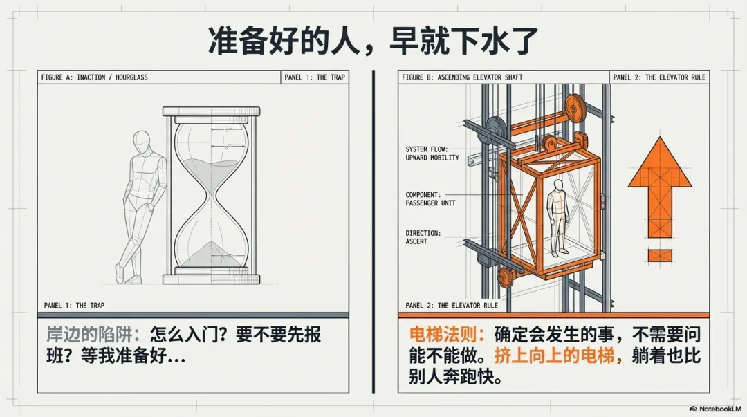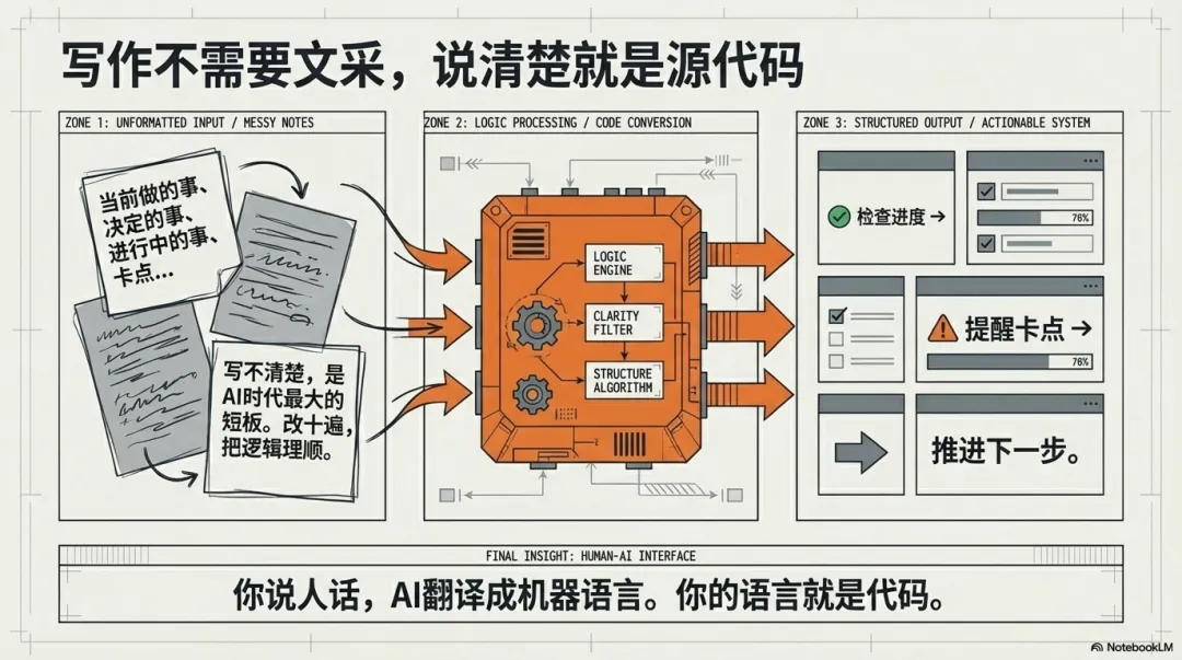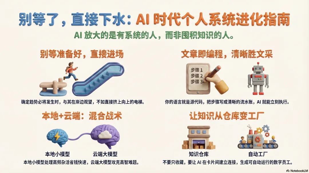 AI时代,最贵的不是技术,是"下水"的勇气你有没有发现,每次新技术浪潮来的时候,总有一批人在岸边反复问同一个问题:怎么入门?问的时候很焦虑,问完继续等。等到什么时候?等到"准备好了"。现实中,很多人还在问:AI到底怎么学?应该从哪里开始?要不要先报个班?胡子哥经历了四次科技浪潮——软件时代、互联网时代、移动互联网时代、AI时代。前三次,他全在岸边站着看别人挣钱,自己拍大腿。移动互联网赶了个尾巴,AI时代,他选择不再旁观。他的结论很简单: 当你确定一件事一定会发生,不需要问能不能做,直接进场。这就像电梯往上走,你得先挤上去。躺着都比别人努力奔跑快。过去,人和机器沟通需要编程语言。C、Java、Python——门槛高到普通人只能望门兴叹。AI时代,规则变了。你说人话,AI帮你翻译成机器语言。但问题来了:同样说汉语,为什么有人能用AI做出完整系统,有人只能让AI讲个笑话?胡子哥在实测中给出了答案: 写不清楚,是AI时代最大的短板。他自己做了一次示范。他没有写什么漂亮的文案,而是打开文件,写下流水账:当前正在做的事、已决定做的事、进行中的事、卡点待解决的事。就这么几行字,交给AI,AI立刻开始执行——检查进度、提醒卡点、推进下一步。写作不需要文采。第一步做什么、第二步做什么、第三步做什么,流水账就够了。如果你说不清楚怎么办?胡子哥的方法是:写下来,改一遍,改两遍,改十遍。 把文章改清楚了,再交给AI执行。 文章即编程,文章即源代码。很多人以为装个大模型就"有系统"了。胡子哥配了本地大模型,但他很清楚: 硬件不等于系统,系统是从你做的事里长出来的。- 本地跑千问3.5 9B(MLX版,5.8GB) ,处理文件、写卡片、打标签——够用,速度快,零token费用。他同时测了27B和32B版本,速度慢30%-40%,性价比不如9B。