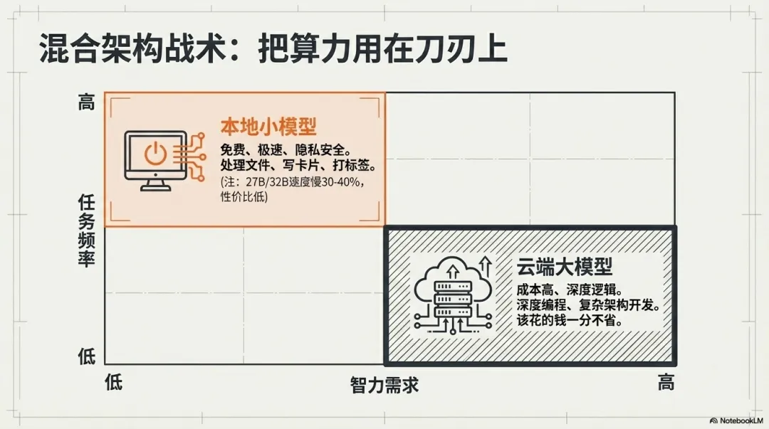 底层逻辑很简单:高频、低智的任务交给本地小模型,省钱又快;低频、高智的任务交给云端大模型,贵但值。AI只放大有系统的人。 没有系统,买再贵的机器也只是买了个玩具。大多数人做知识笔记的方式是:看到好文章→收藏→存到笔记里→从此不看。这不叫知识库,这叫收藏夹。胡子哥每天做一张知识卡片。但他做的不是"记录",而是在训练自己的数字员工。- 每张卡片可运行 ——不是存着好看,是下一步就能执行