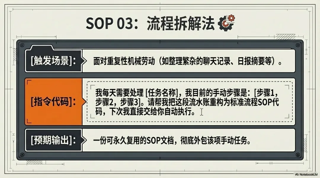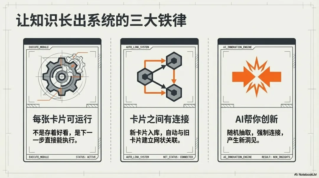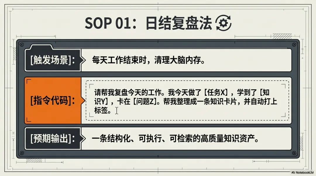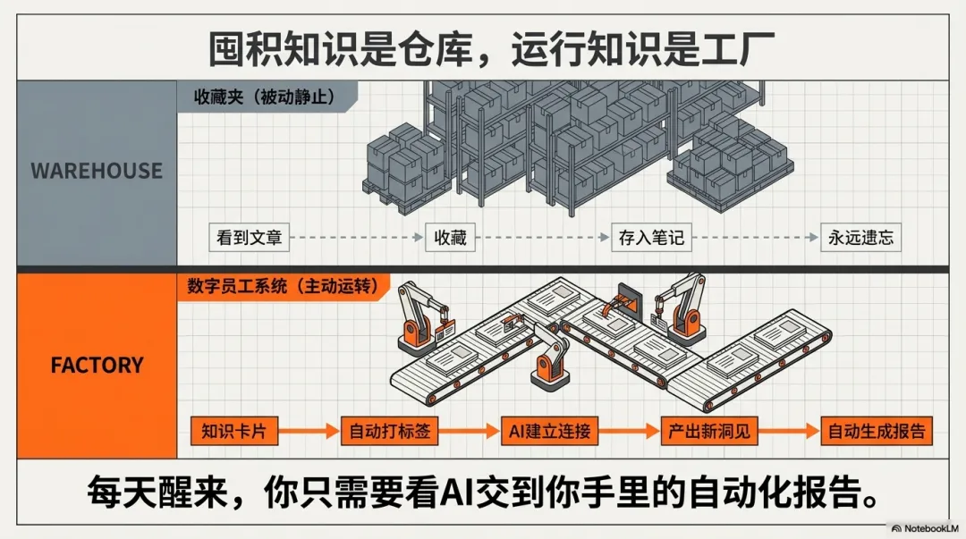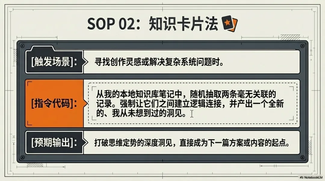 他现场演示了一次:让AI从浮墨笔记里随机抽两条——一条关于安全边际,一条关于系统完善。AI在两条笔记之间建立了连接,产出了三条洞见。他选了第二条继续深挖,让AI纠偏致命错误、补全逻辑、生成新的深度卡片。创新就是在两个毫不相关的事物之间建立连接。 以前靠人脑做,慢且有限。现在AI几分钟就能完成上万张卡片的关联。他甚至让系统自我运转:新卡片入库→自动打标签→自动建立连接→自动生成报告。 他每天醒来,只需要看AI交给他的报告。这就是"囤积知识"和"运行知识"的区别:前者是仓库,后者是工厂。对AI说:"请帮我复盘今天的工作。我今天做了 [ X ] ,学到了 [ Y ] ,卡在 [ Z ] 。帮我整理成一条知识卡片,打上标签。"对AI说:"从我的笔记中随机抽取两条,让它们之间建立连接,产出一个新洞见。"预期结果:一条你从未想到过的关联洞见,可能成为下一篇内容的起点。对AI说:"我每天要整理微信聊天记录,步骤是 [ 描述你的步骤 ] 。帮我写成标准流程,下次我直接交给你执行。"预期结果:一份可复用的SOP文档,从此这个任务不需要你亲自动手。巴菲特说过:如果你找不到一个在睡觉时仍能赚钱的事,你将会工作到死。胡子哥现在的状态是:凡是他能做的事,都写成了文章、流程、SOP,交给AI执行。