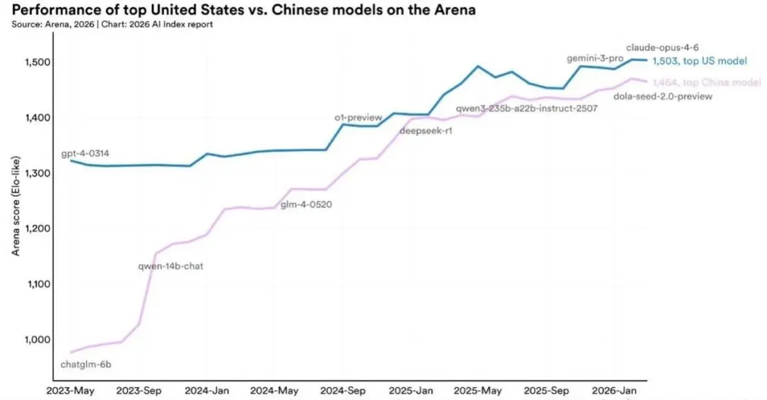再往前翻,2025年2月DeepSeek-R1曾短暂追平美国模型。双方已经进入“交替领先”状态