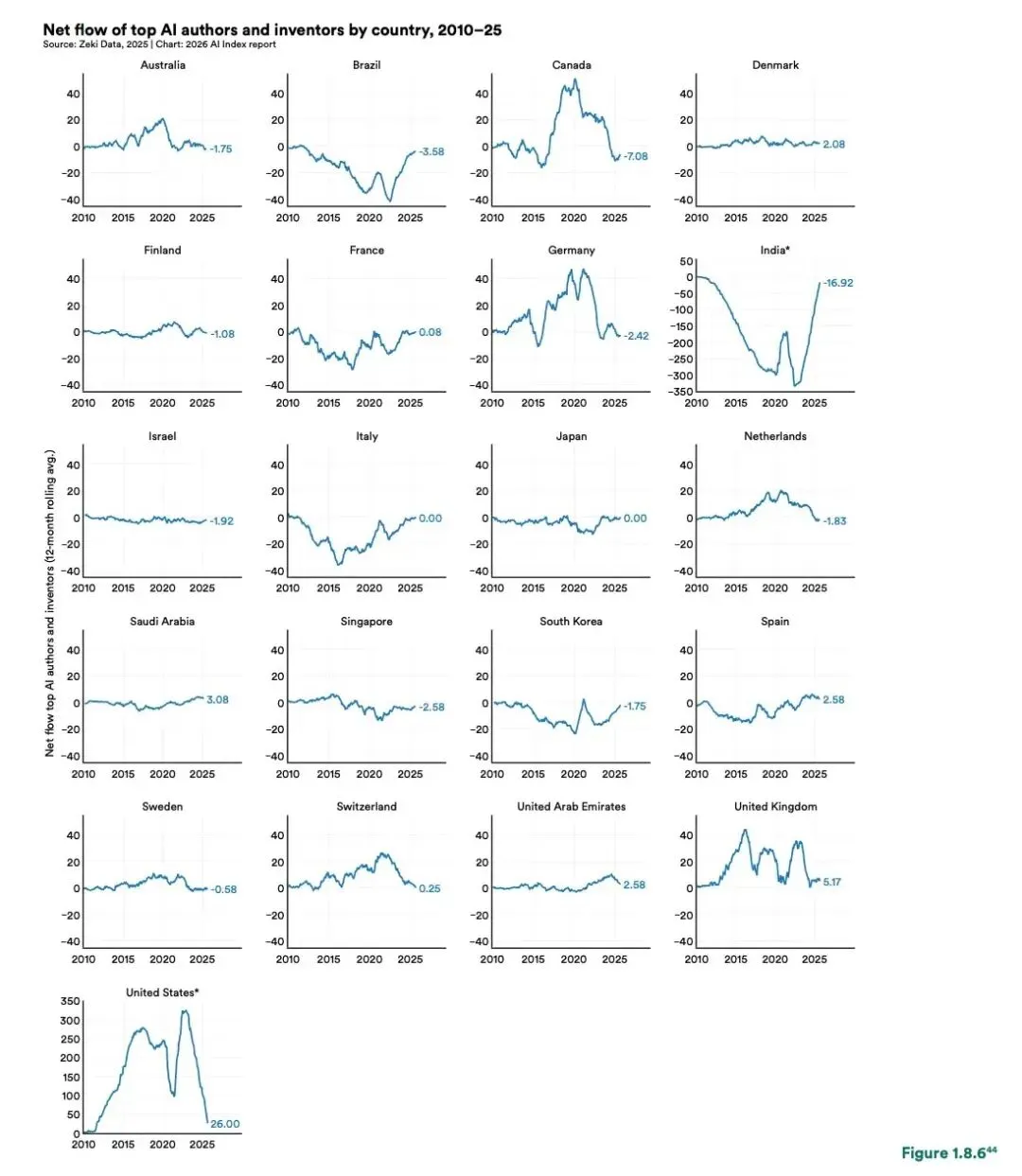 报告里有一张图叫“顶级AI作者和发明家的净流动”(2010-2025):