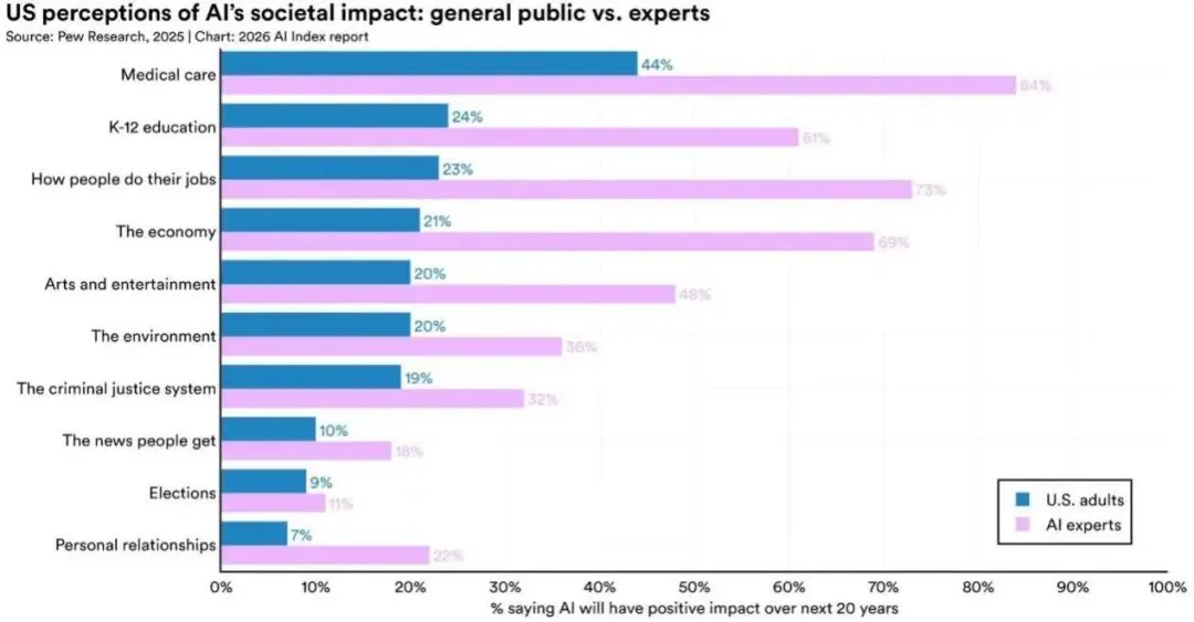 另一个有意思的:医疗领域,专家极其乐观(84%),普通人却只有44%