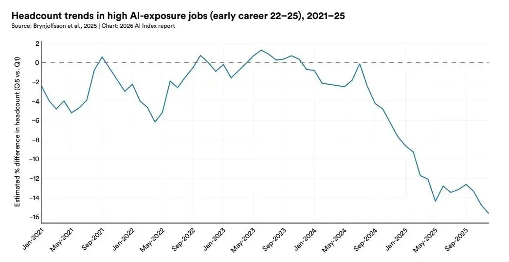 报告追踪了“高AI暴露度”岗位的早期职业(22-25岁)就业人数变化(2021-2025):