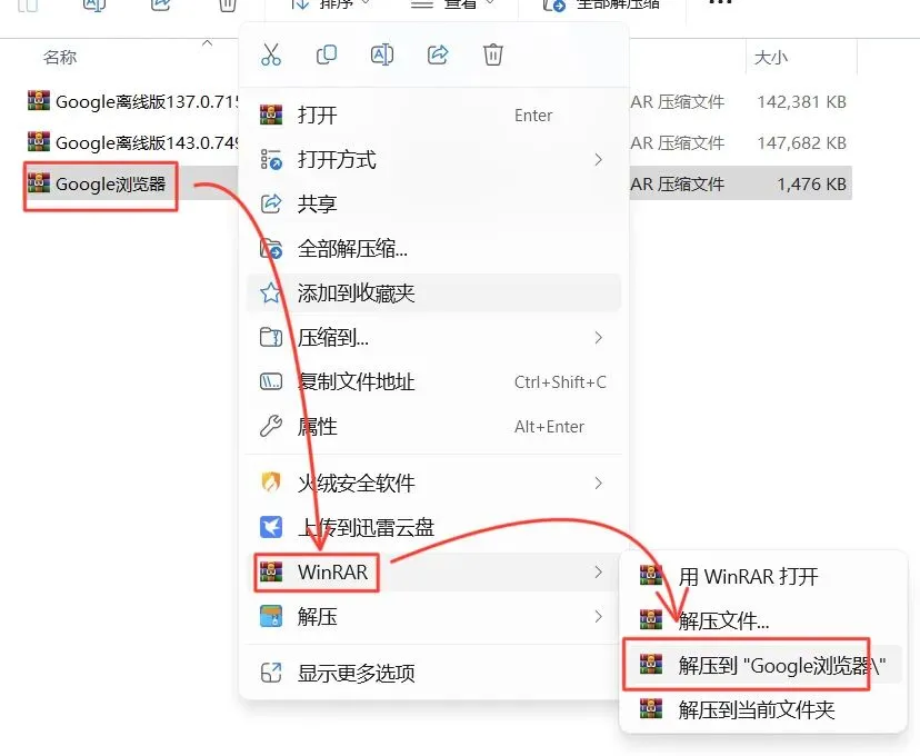 1.打开下载的Google浏览器安装包,鼠标右击压缩包选择【解压到Google浏览器\】。