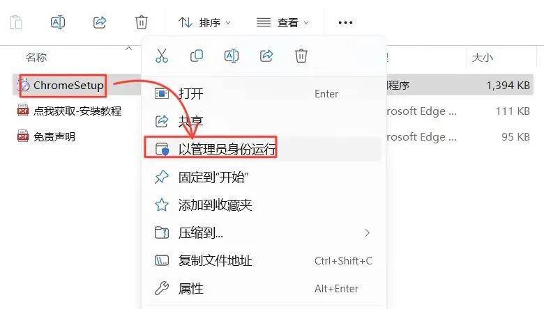 3.打开解压后的文件夹,鼠标右击【ChromeSetup.exe】,选择【以管理员身份运行】。