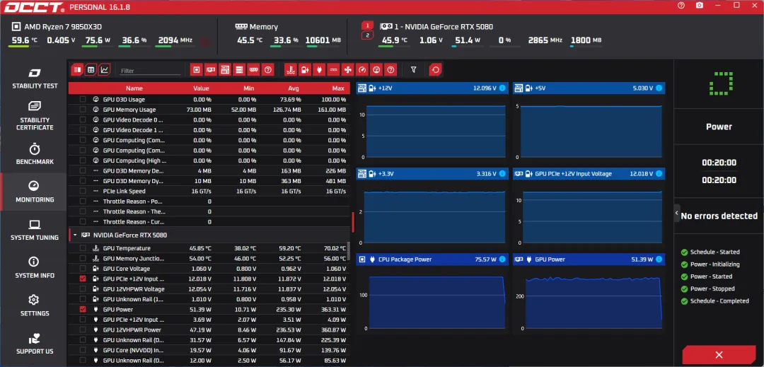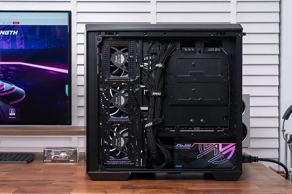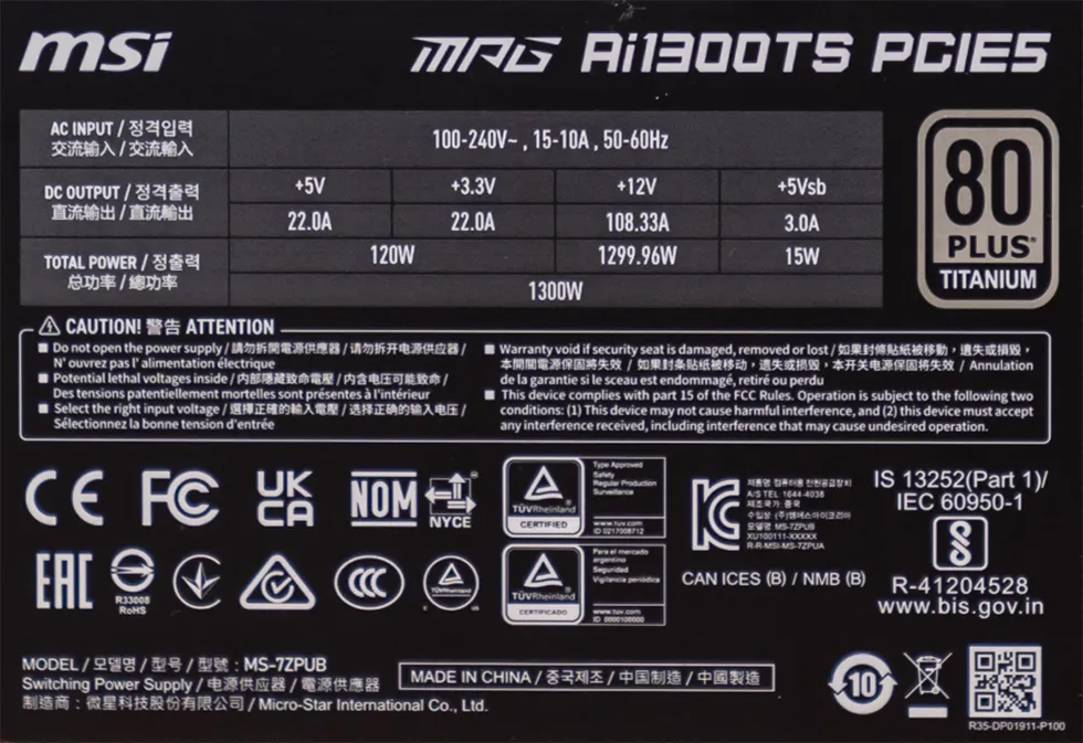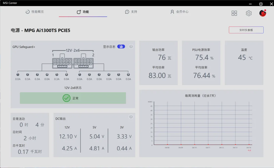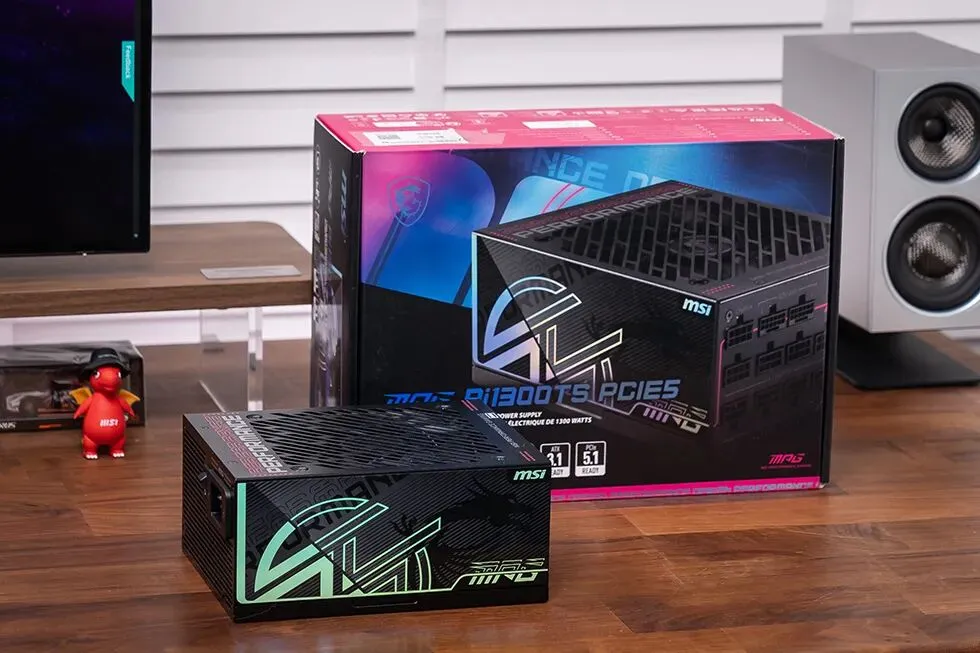 微星MPG Ai1300TS PCIe5月神评测:面向未来的旗舰级供电方案自进入 RTX 50 系列与新一代旗舰处理器普及阶段后,PC 硬件对供电系统的要求早已不再只是 “功率够大” 那么简单。ATX 3.1 与 PCIe 5.1 规范成为刚需,更高的转换效率、更可靠的峰值承载、更安全的显卡防护、更安静的运行体验,共同构成了高端电源的核心考核标准。面对这样的市场需求,微星推出 MPG Ai1300TS PCIe5 电源,以 1300W 额定功率、80PLUS 钛金效率、全模组设计与原生 PCIe 5.1 支持为核心卖点,瞄准高端游戏、内容创作与 AI 计算场景。本文将从产品定位、外观设计、核心参数、实际体验等维度完整解析,看看它能否成为次世代平台的理想供电选择。产品概述微星 MPG Ai1300TS PCIE5 月神定位高端发烧级电源,提供长达 12 年的质保服务。它通过了 80PLUS 钛金、PPLP 115V 钛金和 Cybenetics 白金三重认证,最高转换效率达 94%。电源采用全数字主控方案,内部引入新能源汽车同款碳化硅 (SiC) MOSFET 元件,搭配全日系 105℃耐温电容,能承受 240% 总功率峰值和 300% GPU 功率峰值,完全符合 ATX 3.1 和 PCIe 5.1 规范。核心亮点在于搭载了进阶版 GPU Safeguard + 技术,配备双原生 12V-2×6 接口,支持显卡过载保护和电流实时监测,为高端显卡提供主动防护。外观设计微星 MPG Ai1300TS PCIe5 外包装采用黑色基调,搭配MPG 系列的蓝紫色渐变主题色,正面为产品主图和产品型号,左下角标识有GPU Safeguard + 、碳化硅SiC、80PLUS 钛金,ATX3.1及PCIe5.1规范等认证。包装反面则是主要产品特性及相关参数介绍。打开包装后可以看到盒体内采用了厚实柔软的泡沫海绵材质进行全方位填充,有效缓解运输过程中可能出现的碰撞与挤压。除主体防护外,包装内还单独配备收纳袋,专门用于收纳模组线缆,提升收纳的整洁性与便利性。MPG Ai1300TS PCIE5 采用标准 ATX 电源尺寸 (190×150×86mm),机身长度 190mm,比常规电源略长,视觉上显得更为大气。电源外壳采用磨砂黑色涂层,搭配顶部的 "MPG Ai1300TS PCIE5" 亮银发光字样和侧面的微星龙型徽记,彰显高端定位。风扇格栅采用密集型蜂窝状设计,既保证了充足的进风量,又能有效防止异物进入。内部配备 135mm FDB 流体动态轴承风扇,支持低负载停转技术,当负载低于 40% 时,风扇完全停止转动,实现零噪音运行。随着负载和温度的上升,风扇会平滑线性调整转速,确保高效散热的同时,始终将噪音控制在极低水平,通过了 Cybenetics A+高级别静音认证。散热片采用加大设计,面积达到常规散热片的两倍以上,增强了被动散热能力,即使在风扇停转时也能有效散发热量。尾部接口区域采用全模组布局,接口排列整齐、标识清晰,装机时可以快速分辨,大幅降低接线错误概率。最具辨识度的是配备了2个原生 12V-2×6 PCIe 5.1 接口,对应模组线采用黄黑双色设计,用户可以直观判断接口是否完全插紧,有效避免接触不良带来的安全隐患。为支持实时输出数据监测功能,该电源特别配置了USB Type-C接口,可连接至微星MSI Center软件以实现实时监控与参数设置。线材采用压纹设计,UL 认证线材搭配合金铜端子,柔韧度高、弯折顺畅,预装理线梳,不仅方便机箱内部理线,还能提升整体美观度并优化风道,配合人性化的细节处理,无论是新手还是资深玩家都能获得流畅的装机体验。配备1条24Pin主板供电线(长度600mm)、2条8Pin CPU供电线(长度650mm)、2条12+4Pin 12V-2x6供电线(长度600mm)、5条8Pin PCI-E供电单线(长度600mm)及1条采用"一拖二"设计的8Pin PCI-E供电单线(长度600mm),总计包含7个8Pin PCI-E接口;另含2条采用"一分四"设计的SATA供电线(线长500+150+150+150mm),总计提供8个SATA接口;以及1条采用"一分四"设计的D型4Pin供电线(线长500+150+150+150mm)。此外,鉴于额定功率较高且需符合安全规范要求,故配置C19型AC输入接口,并配备独立开关。核心参数作为一款面向旗舰平台的 1300W 电源,MPG Ai1300TS PCIe5 的核心参数完全贴合次世代硬件需求。它通过 80PLUS 钛金认证,典型负载下转换效率可达 94% 以上,在高负载下依旧保持高效运行,既降低能耗,也减少发热。电源严格遵循 ATX 3.1 与 PCIe 5.1 规范,具备强悍的峰值承载能力,可轻松应对显卡与 CPU 瞬间爆发的高功率需求,杜绝因功率波动导致的死机、重启或掉帧。内部采用交错APFC+全桥LLC+SR+DD方案,电压输出纯净、纹波控制优秀,长时间高负载下依然保持稳定。关键用料方面选用全日系 105℃耐高温电容,配合服务器级英飞凌碳化硅SiC(PFC)MOSFET,大幅增强稳定性、减少损耗,整体耐用性大幅提升。同时,电源具备完整的工业级保护机制:OCP/ OTP/ OPP/ SCP/ OVP/ UVP/ SIP/ NLO保护认证,为整套平台提供全方位安全兜底。从背面的参数铭牌可以得知电源额定功率为 1300W(115 - 240Vac),采用单路 + 12V 输出设计,+12V 输出电流额定 108.33A,功率达 1299.96W,主流高端平台供电需求都能轻松满足。+5V 与 + 3.3V 额定电流均为 22A,联合输出功率 120W;+5V 待机额定电流为 3.0A,满足多数平台使用。GPU Safeguard + 技术作为 MPG Ai1300TS PCIE5 最核心的特色功能,通过三颗 INA4180 芯片实现两个 12V-2×6 接口的独立过载保护和电流实时监测。当检测到显卡功耗异常升高时,电源会迅速采取限流措施,防止显卡因过流而损坏,同时通过 MSI Center 软件向用户发出预警。相比传统的过流保护,GPU Safeguard + 响应速度更快,保护更精准,特别适合 RTX 5090 等功耗高达 600W 以上的旗舰显卡。采用先进的全数字电源主控 (MCU),相较于传统