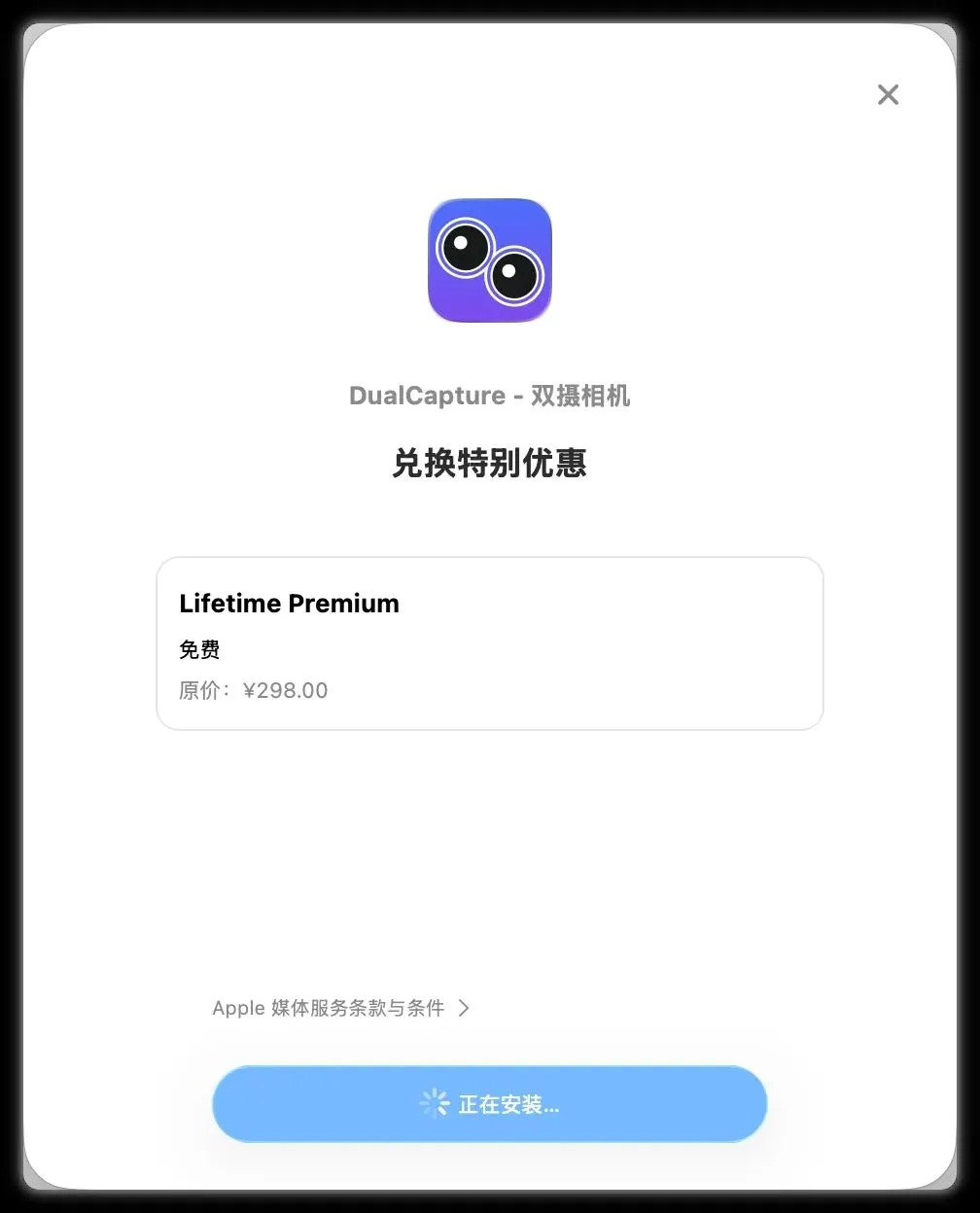 iOS限免¥298→0,前后摄像头同时摄像神器水果软件管家每个果粉都应该关注的一个公众号关注水果软件管家你可以获取少有人知的苹果软件和技巧今天终于被我找到了一款前后摄像头同时摄像的神器原本需要298,今天有兑换码0元搞定直接从我结尾提供的链接在Safari浏览器打开然后你们就可以看到免费的兑换优惠了点击安装兑换即可搞定这款DualCapture 主要功能就是同时从 iPhone 的两个摄像头录制并保存三个独立的文件你的前置摄像头视频、后置摄像头视频以及一个合并的合成视频你可以分别编辑每个角度,或立即分享合并的视频其他也没啥可介绍的趁现在可以搞定,千万不要错过如果你经常需要同时拍摄这种解说视频这个是真的很实用的呢如果打开没有这个免费就不要下载了别被错误收费了哈热门推荐刺激,App Store 又能下载了“激活码”泄露,不要贩卖,大肆传播真有创意的APP,把照片细节变成一枚邮票软件下载限免获取地址https://apps.apple.com/redeem?ctx=offercodes&id=6756251524&code=GETFREEAPP