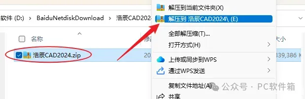 1.解压安装包:鼠标右击【浩辰CAD2024】压缩包,选择电脑上安装的解压软件,点击【浩辰CAD2024】。