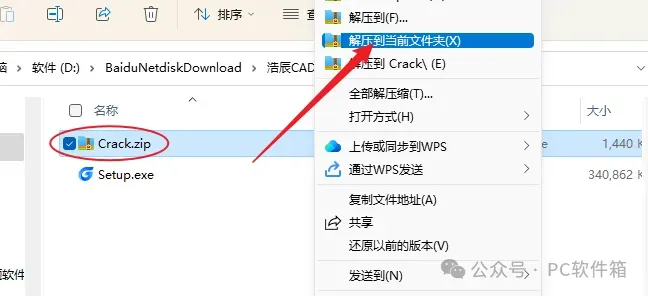 9.打开安装包解压后的【浩辰CAD2024】文件夹,鼠标右击【Crack】压缩包,选择【解压到当前文件夹】。