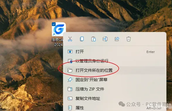 11.鼠标右击桌面【浩辰CAD2024】选择【打开文件所在的位置】。