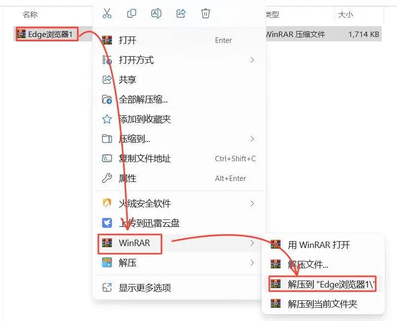 1.打开下载的Edge浏览器安装包,鼠标右击压缩包选择【解压到Edge浏览器\】。
