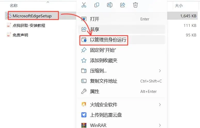 3.打开解压后的文件夹,鼠标右击【MicrosoftEdgeSetup】,选择【以管理员身份运行】。