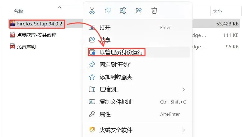 3.打开解压后的文件夹,鼠标右击【Firefox Setup 94.0.2】,选择【以管理员身份运行】。