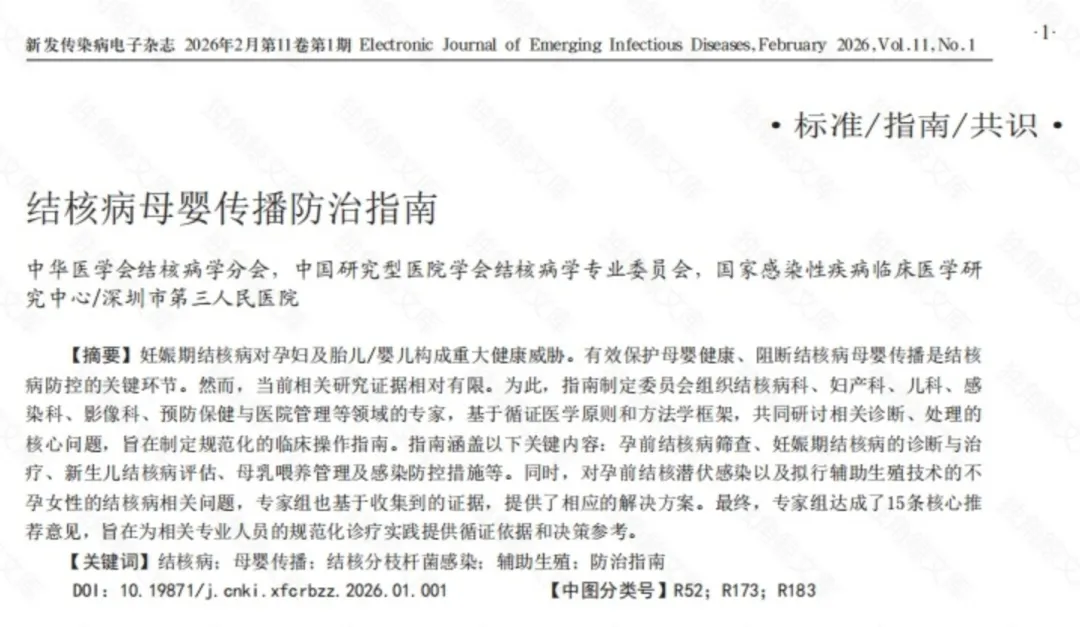 【摘要】妊娠期结核病对孕妇及胎儿/婴儿构成重大健康威胁。有效保护母婴健康、阻断结核病母婴传播是结核病防控的关键环节。然而,当前相关研究证据相对有限。为此,指南制定委员会组织结核病科、妇产科、儿科、感染科、影像科、预防保健与医院管理等领域的专家,基于循证医学原则和方法学框架,共同研讨相关诊断、处理的核心问题,旨在制定规范化的临床操作指南。指南涵盖以下关键内容:孕前结核病筛查、妊娠期结核病的诊断与治疗、新生儿结核病评估、母乳喂养管理及感染防控措施等。同时,对孕前结核潜伏感染以及拟行辅助生殖技术的不孕女性的结核病相关问题,专家组也基于收集到的证据,提供了相应的解决方案。最终,专家组达成了15条核心推荐意见,旨在为相关专业人员的规范化诊疗实践提供循证依据和决策参考。