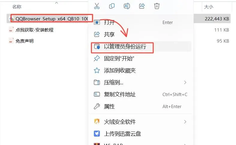 3.打开解压后的文件夹,鼠标右击【QQBrowser…】,选择【以管理员身份运行】。