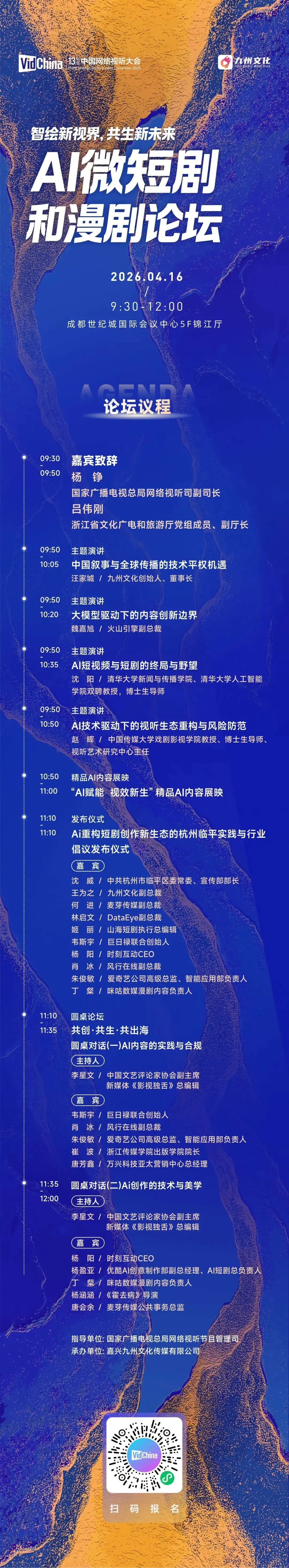 作为第十三届中国网络视听大会的重点分论坛之一,AI微短剧和漫剧论坛将于4月16日上午在成都世纪城国际会议中心5层锦江厅举行。