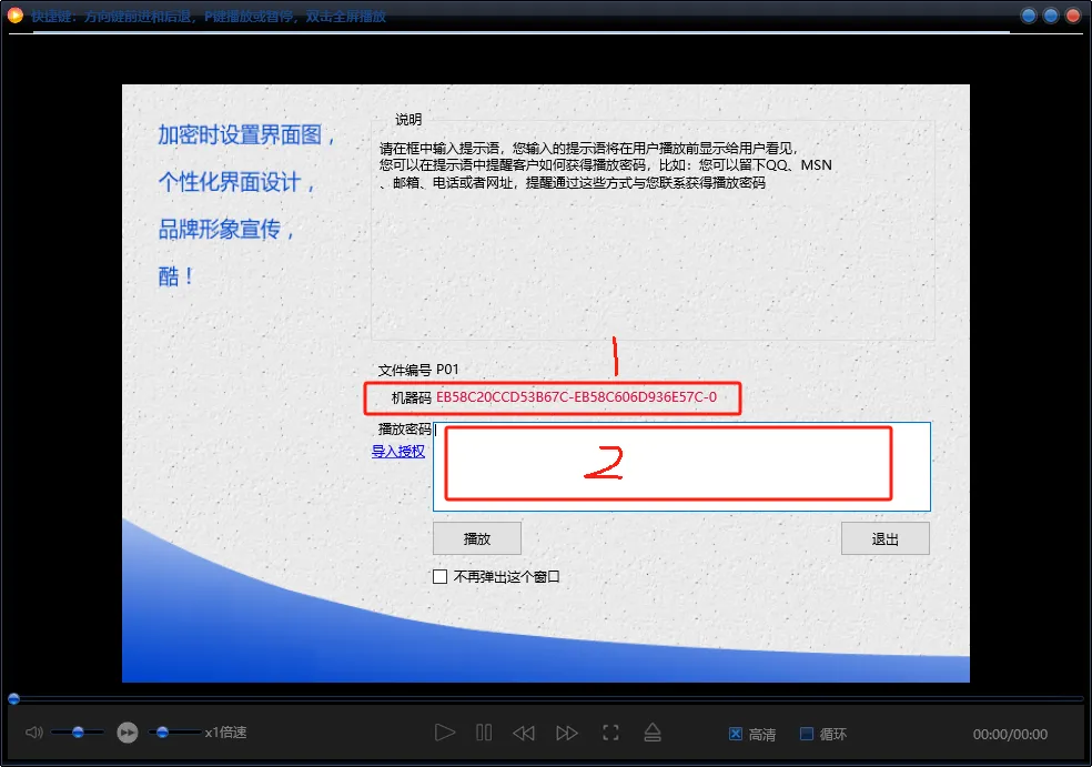 视频需要使用专用播放器进行播放,下载播放器,导入任何一个视频,将下图1所示的机器码发给我即可进行解锁,然后将解锁码填入图中2部分即可,一次解锁即可观看全部内容。