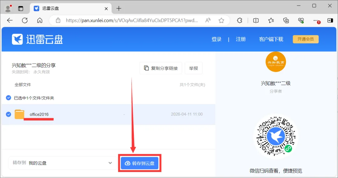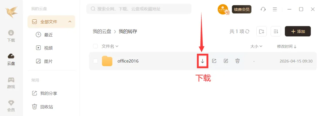 | (4)在迅雷云盘里找到“office2016”文件夹并下载到电脑上 |