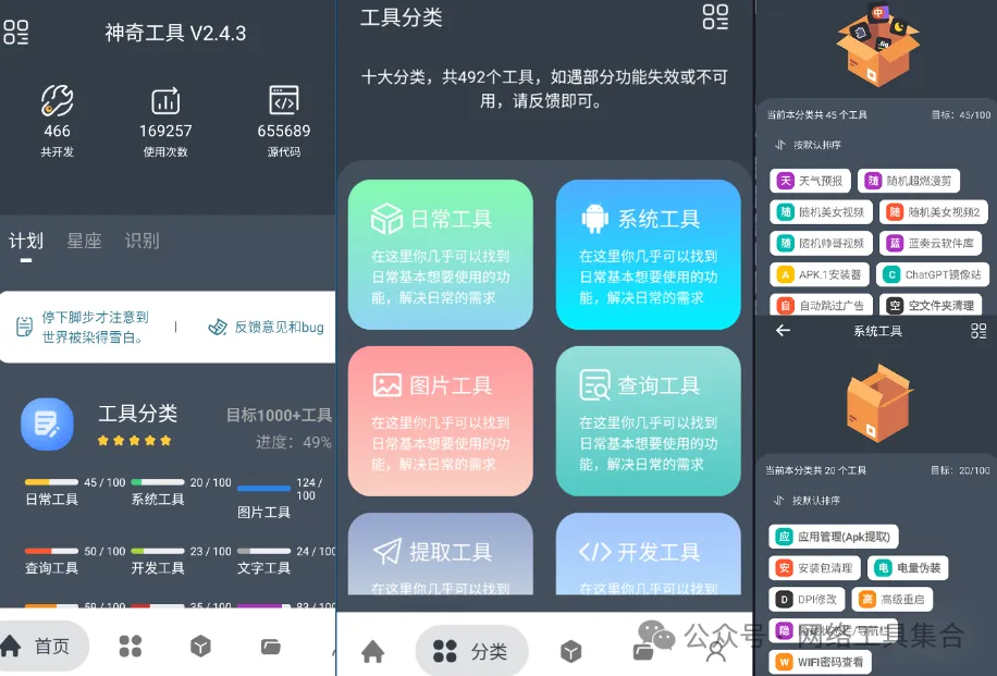 在首页就可以看到,显示了软件的使用次数和各个分类的软件数量。不得不说软件真的多!像常用的工具,如:APK提取、电量伪装、VIP解析、翻译以及各种直播等全部都有。