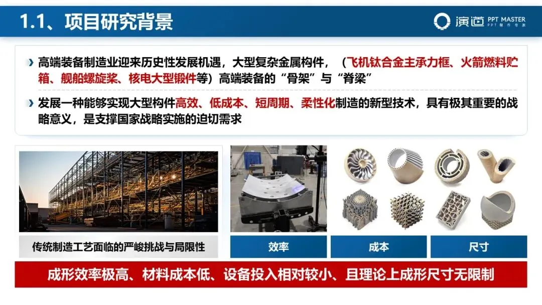 答辩 PPT点明传统制造工艺局限性,围绕 “控形、控性、装备” 三大核心,为技术攻关指明靶点,体现项目攻关必要性。