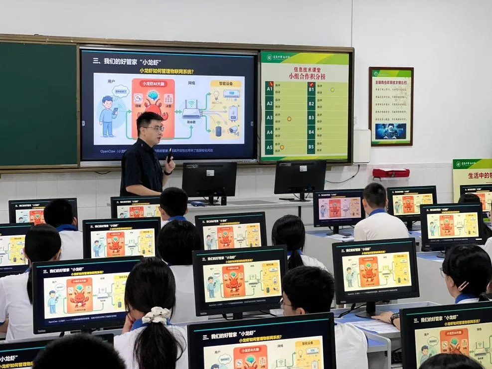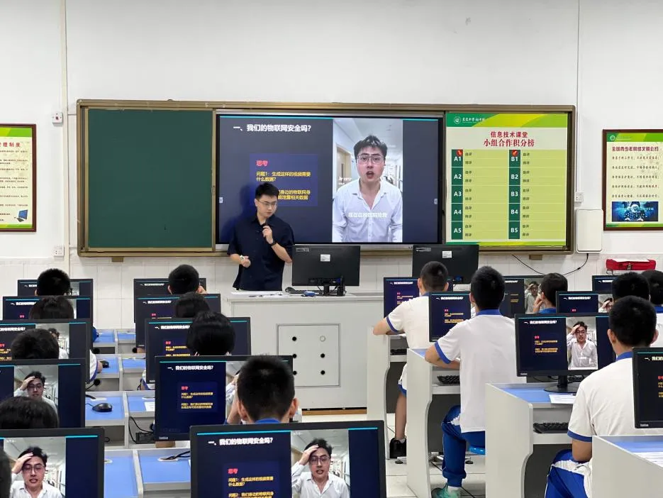 活动伊始,工作室学员钟凯宏老师带来了一节题为《物联网安全——网络攻防战》的精彩课例。钟老师以社会热点——AI“数字人”及“小龙虾”(即AI智能体OpenClaw)爆火现象及其背后潜藏的安全隐患导入,迅速点燃学生兴趣,并自然引出物联网安全的核心议题。