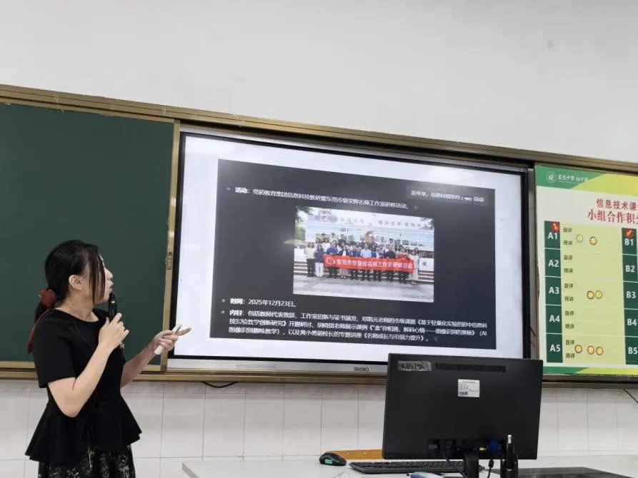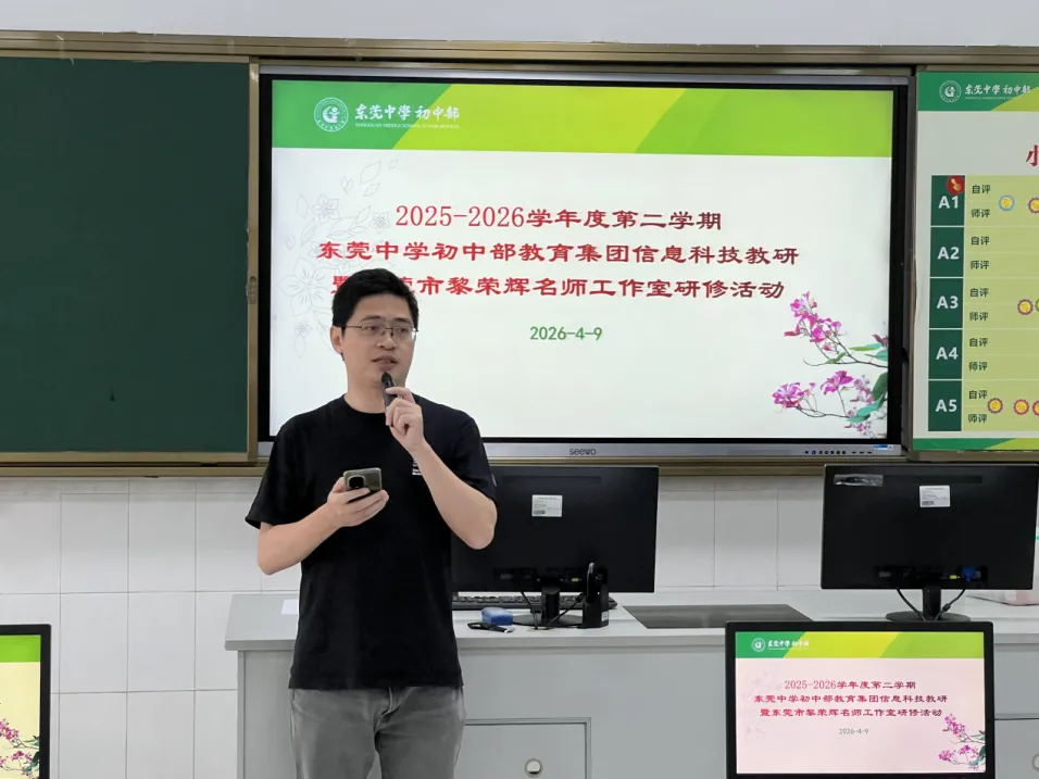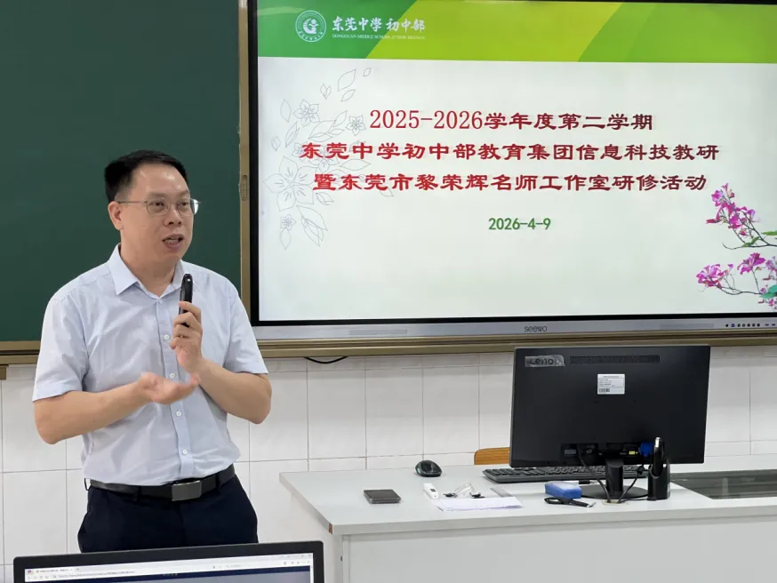 2026年4月9日上午,东莞市黎荣辉名师工作室2026年第2期研修活动在东莞中学初中部圆满举办。为充分发挥名师的示范引领作用,本次活动采取“线上+线下”双线并行模式。除工作室入室学员、网络学员外,东莞中学初中部教育集团成员校麻涌古梅一中、低涌中学的全体信息科技教师同步参研,切实将优质教研资源延伸至集团信息科技学科,有效凝聚了区域教研合力。