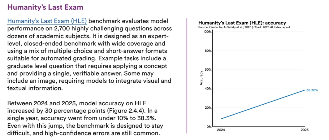 报告引用了一个名为"Humanity's Last Exam"(人类最后考试)的基准测试。该测试包含2700个专家级问题,覆盖数十个学科,设计初衷就是让AI难以通过。