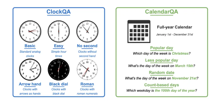 另一项研究(Saxena et al., 2025)测试了七个多模态模型在ClockQA上的表现。ClockQA包含62张模拟时钟图片,涵盖六种视觉样式。表现最好的模型Gemini-2.0,精确匹配准确率仅为22.6%。