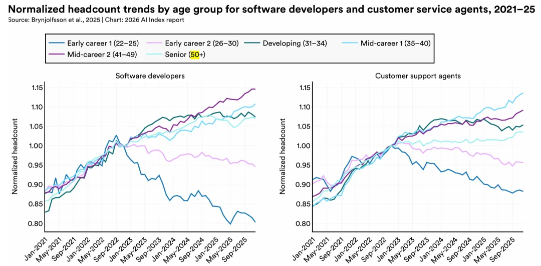 客户服务岗位呈现完全相同的模式。22至25岁从业者的就业下降幅度与软件开发者几乎一致,而年长年龄组的就业持续增长。