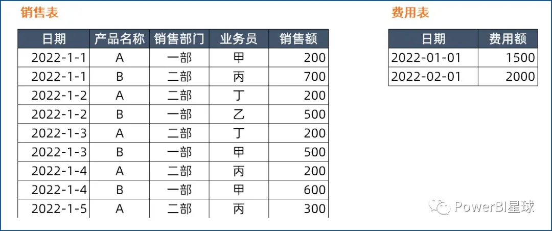 假设有两张表,一个是每日销售表,一个是每月发生的费用,模拟数据如下: