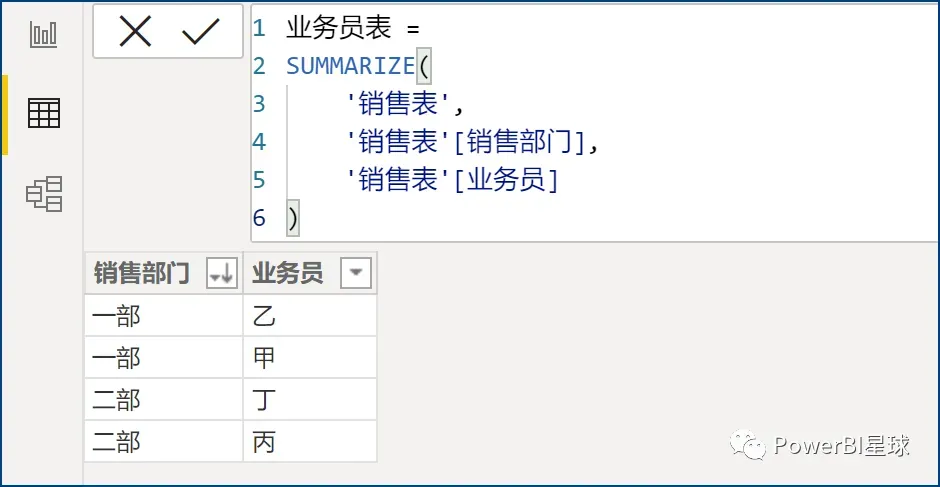 业务员表 = SUMMARIZE( '销售表', '销售表'[销售部门], '销售表'[业务员] )