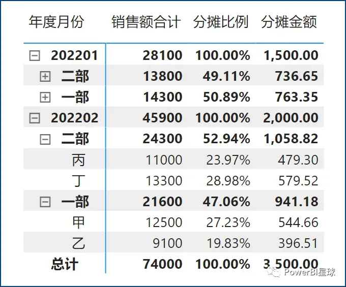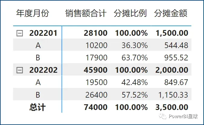 分摊比例 = DIVIDE( [销售额合计], CALCULATE([销售额合计],ALLEXCEPT('销售表','日期表'[年度月份])) )