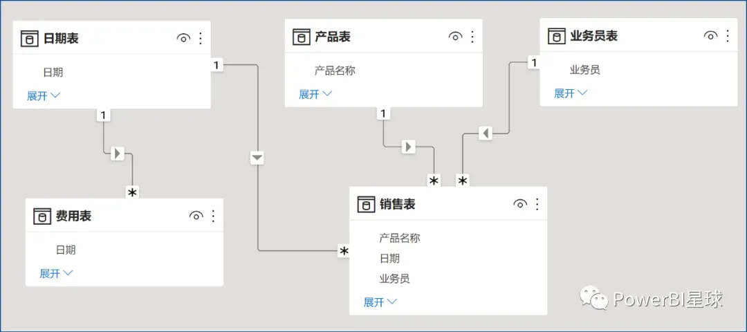通过上面的准备工作,现在有5张表,原有的销售表、费用表,以及新建的产品表、业务员表和日期表。