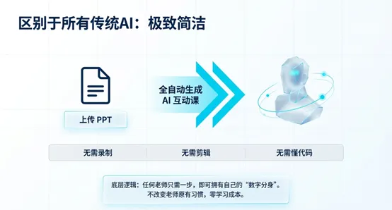 · 教师沿用原有PPT,云端一键生成AI互动课,无需录影棚,低成本快速落地