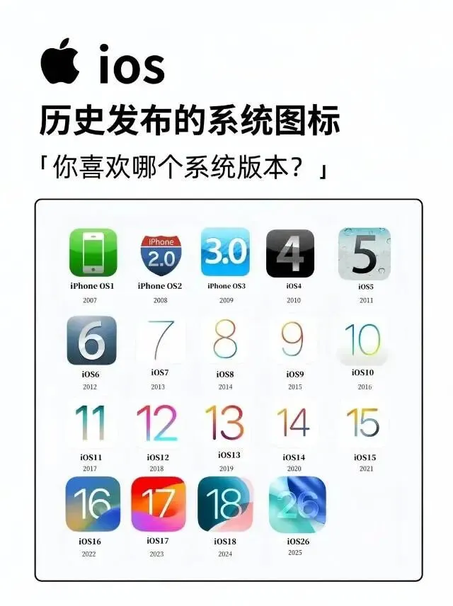 2007年的iPhone OS 1以拟物化的绿色电话图标登场,奠定了苹果的设计基因;2013年iOS 7彻底转向扁平化,开启了全新的视觉语言;从iOS 11到iOS 18,图标在简约中融入渐变、毛玻璃等细节,而2025年的iOS 26更是以通透的流体设计,将美学与交互推向新高度。每一次图标迭代,都对应着系统功能的全面升级:从初代仅支持基础通讯,到如今AI大模型、隐私安全、跨设备协同的全面赋能,iOS用十五年完成了从“手机系统”到“智能生态中枢”的蜕变。
