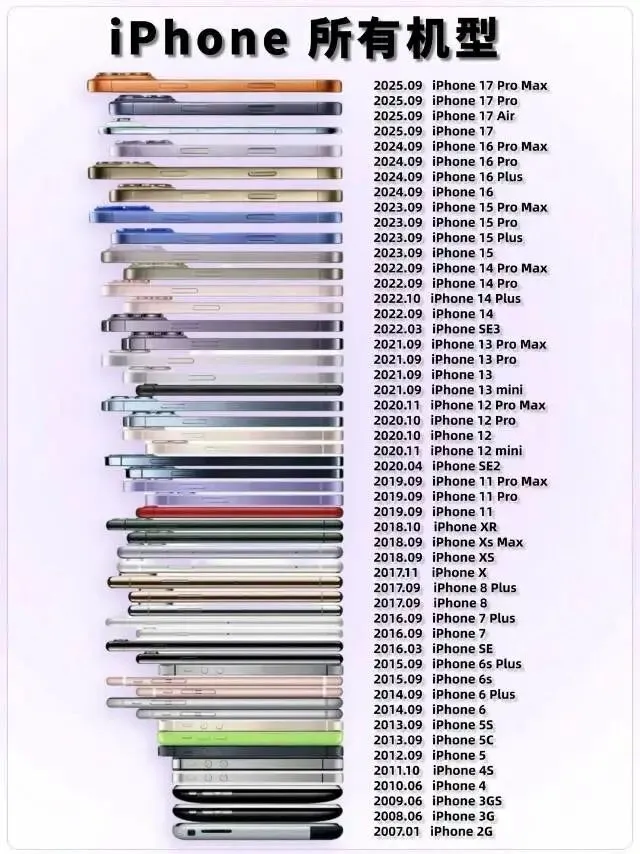 2007年的iPhone 2G以革命性的多点触控,颠覆了功能机时代;从iPhone 4的视网膜屏幕,到iPhone X的全面屏,再到如今iPhone 17 Pro Max的钛金属机身与AI算力,每一代机型都引领着行业标杆。从3.5英寸小屏到6.9英寸巨幕,从单摄到四摄系统,从3G网络到5G+卫星通信,iPhone的进化,是硬件技术与用户需求的双向奔赴。