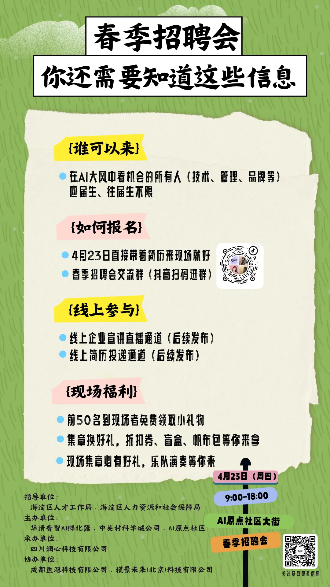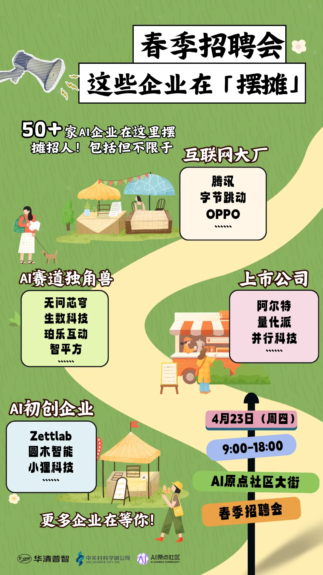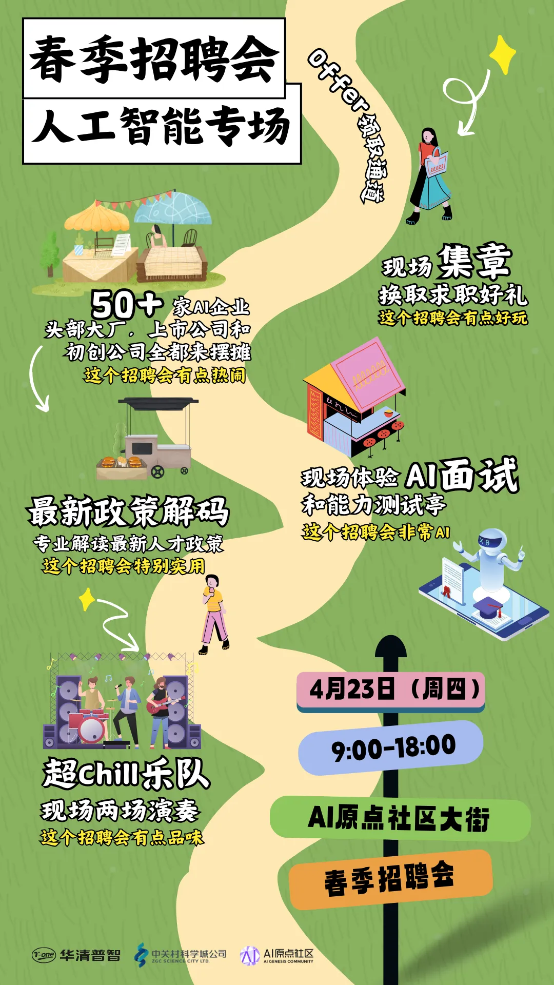 4月23日,由华清普智AI孵化器、中关村科学城公司、AI原点社区联合主办的「春季招聘会·人工智能专场」,将在AI原点社区户外街区举行。