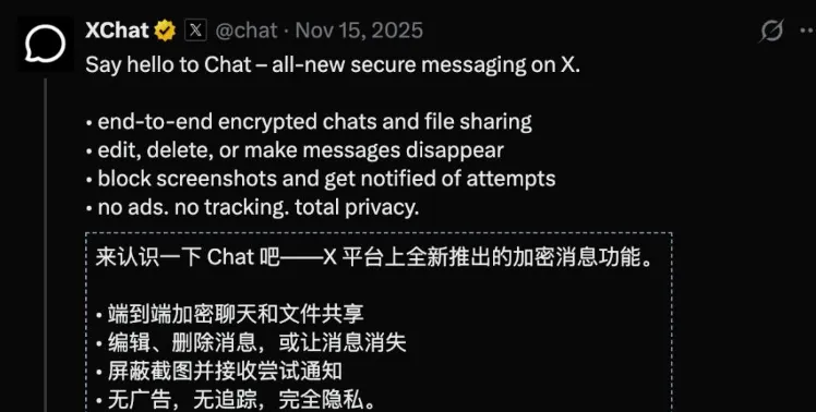 XChat默认开启端到端加密——理论上只有收发双方能读取消息内容,连X平台自己都看不到。