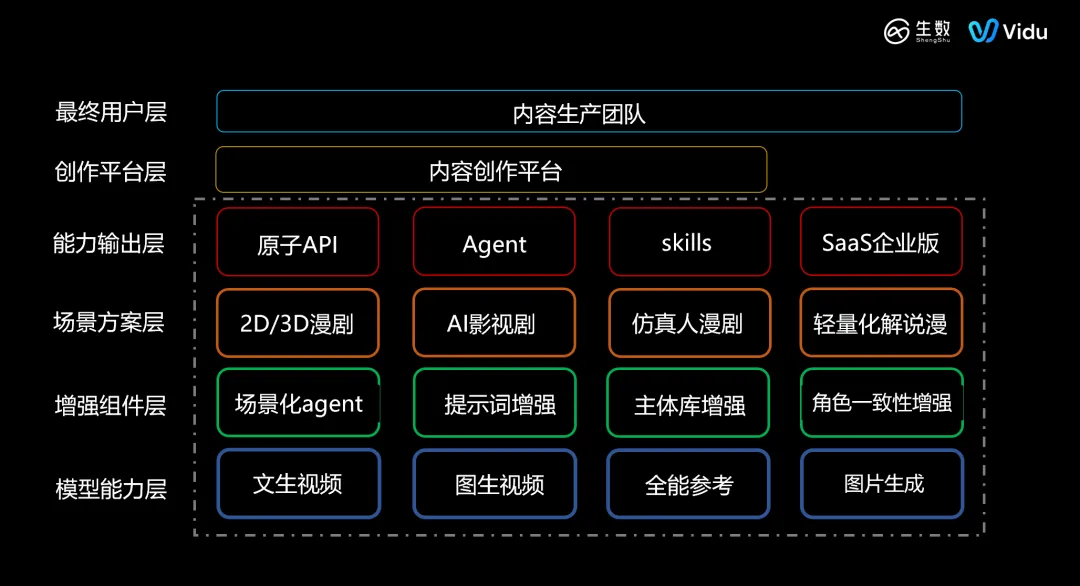 -模型能力层:作为核心技术底座,涵盖文生视频、图生视频、参考生视频、音频生成等核心原子能力,为全链路内容生产提供基础AI生成支撑。