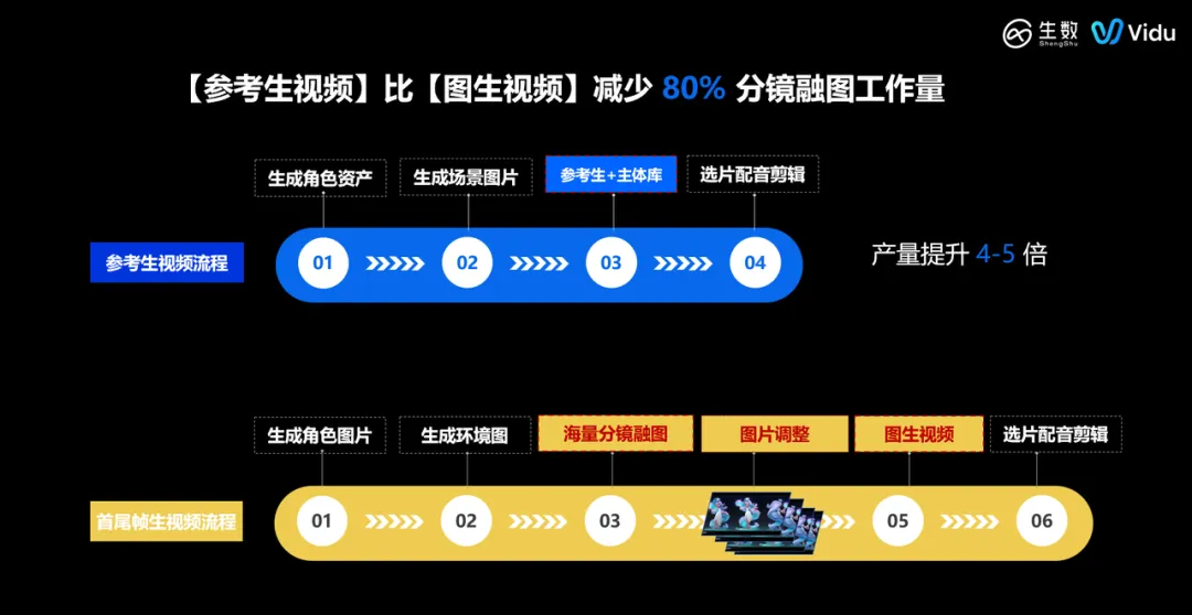 与传统“图生视频”需要经历“生成角色图→生成环境图→海量分镜融图→图生视频”的六步线性流程不同,“参考生视频模式”构建了“生成角色资产→生成场景图片→参考生+主体库→选片配音剪辑”的四步闭环。其核心优势在于: