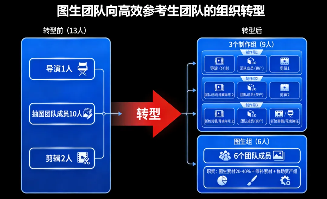 -转型后架构:拆分为3个标准化制作组(9人)+1个专项支撑图生组(6人),形成“多线并行、高效协同”的工业化生产单元;
