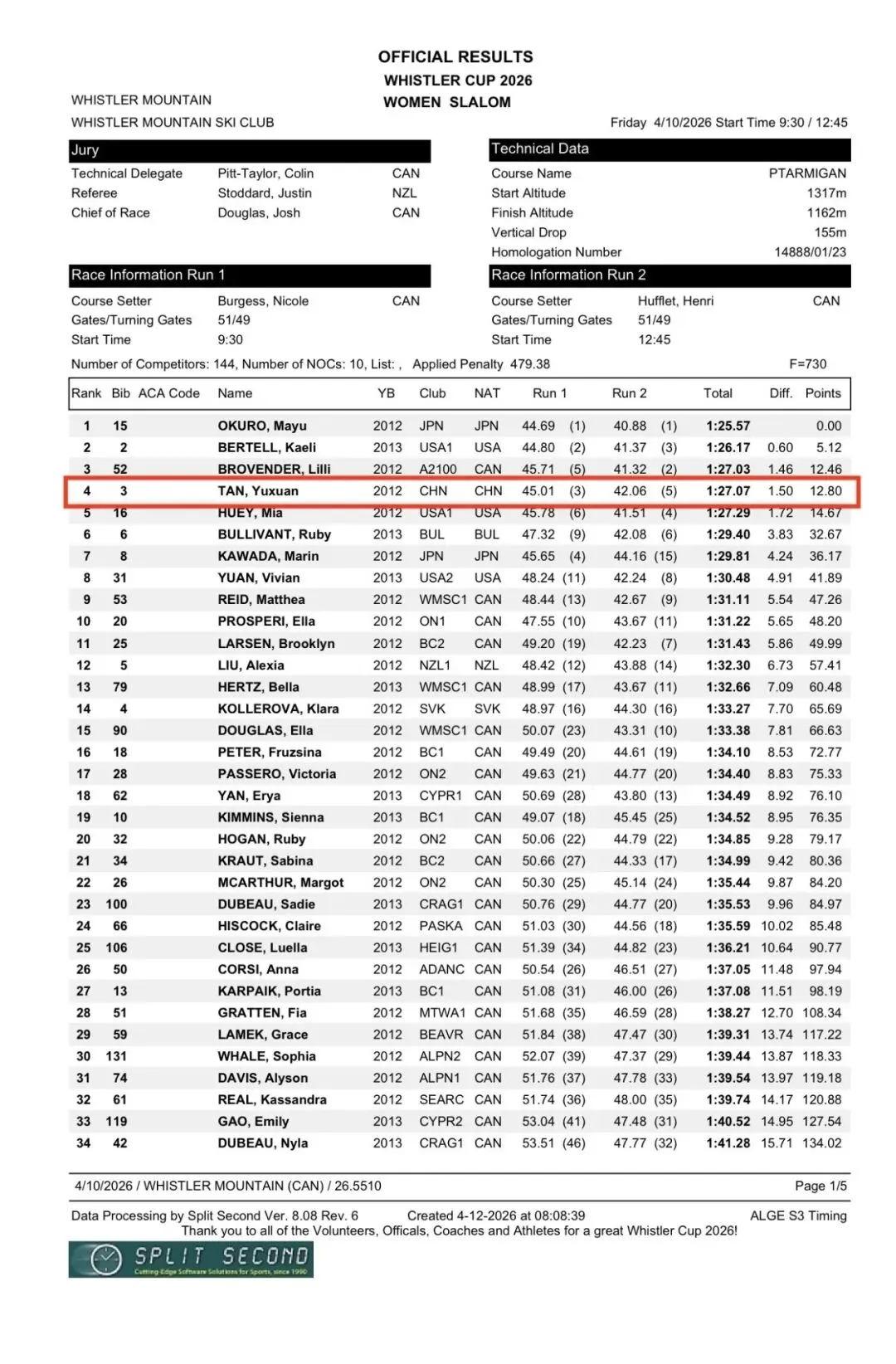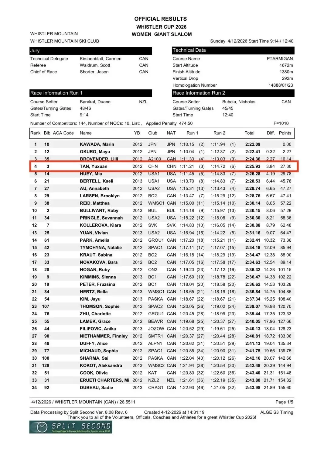 本届惠斯勒杯,中国小将谭语暄(CiCi),在U14这个神仙打架的组别中(144名全球顶尖精英选手激烈角逐),一举拿下回转和大回转两个项目第四名!在可报名参赛的组别中均名列前茅, 这绝非普通的好成绩,而是极其出色的突破。回转项目门槛高、容错率极低,在欧美长期强势的滑雪领域,中国小将能一路杀出重围,格外不易。这份成绩的背后,是 CiCi 持续的热爱与坚持,是Mahdi教练专业细致的指导与打磨,是硬实力的绝对证明!