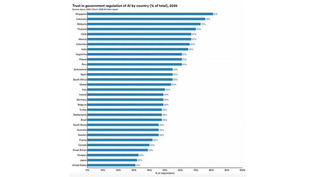 据The Rundown援引斯坦福HAI在2026年4月13日发布的《2026 AI Index Report》,生成式AI已经在三年内触达全球约53%的人口,扩散速度快于个人电脑和互联网在相同阶段的普及速度。但与此同时,公众信任并没有同步提升。报告显示,仅有31%的美国人信任政府能够妥善管理AI带来的变化。在就业影响上,专家和公众之间也出现了明显认知落差。接近四分之三的AI专家对AI对就业的影响持乐观态度,但普通公众中只有约23%持相同看法。此外,报告还提到,美国虽然仍是AI建设最强的国家之一,但在实际采用率上并不领先;年轻开发者群体的就业压力也在上升。