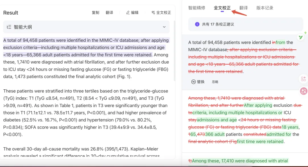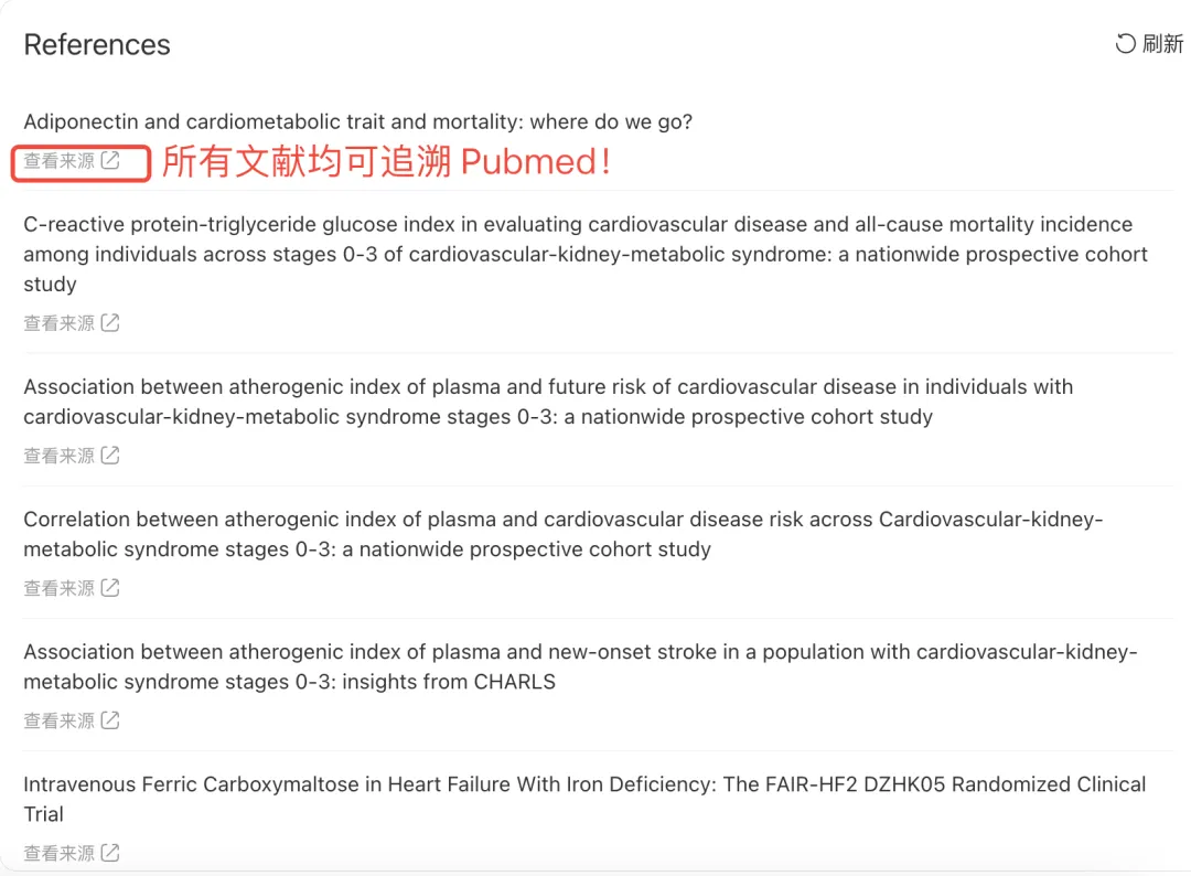 所以,我们的 AI 写作助手向你保证:工具内置 PubMed 数据库实时检索接口,所有引用的文献均可追溯原文、核对信息。从来源上杜绝「幻觉」,每一篇参考文献都真实可查。